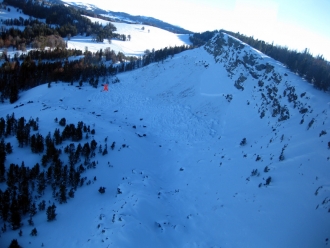 The 911 SPOT message was relayed to Madison County SAR. Soon after receiving it they asked for assistance from Gallatin County SAR since they have a Heli-Rescue Team. Karl Birkeland and I met the helicopter at the Gallatin County Fairgrounds and flew to the scene. We arrived at approximately 1530 and within 15 minutes had the victim placed in a net for long-line helicopter extrication. While he was being flown out I interviewed the party while Karl looked at the avalanche. The helicopter returned at 1615 to pick up Karl. I rode the victims snowmobile out to the trailhead arriving at 1800.