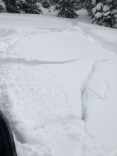 Cracking and collapsing on a 31-degree slope near the Lionshead area down south. The slab was 3-4' deep, and the slope was on the verge of being steep enough to avalanche. From the email: " fractured about 20’x10’ area initially, maybe 3-4’ deep. We got off the hill and it continued to fracturfractureger spots but did not slide mslidehan a foot total." Photo: S. Thompson