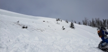 This natural wet slab avalanche on Wall Mountain outside of Cooke City failed near the ground. It was big- estimated crow size was 3-6' deep and 400' wide. Photo: B. Fredlund