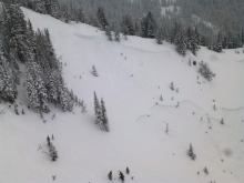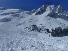 From e-mail: "We observed a rather large natural slide come down within a 100' of us as we were beginning our ascent in some thick old-growth Douglas Fir woods next to the terminus of a large south-facing gully/slide path.