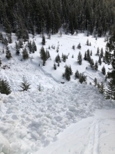2/3. "Large natural avalanche on the south face of peak 10,201. Looked to be a day or two old and the crown looked to be 3-4 feet deep in places."