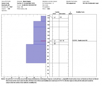 Near Cooke City over the last two days, my partner and I found weak facets about 1 foot above the ground mostly where the snowpack is a meter deep or less. It is a tricky situation because some slopes have a deep (over 5 feet) and somewhat strong snowpack. This variability is scary because it can be hard to tell which slopes are more likely to produce an avalanche. Without a careful snowpack evaluation and terrain selection, riding in avalanche terrain will be like playing Russian Roulette. Eventually you lose. I was fooled yesterday and rode into a chute on Scotch Bonnet. Fortunately as I pulled the trigger, I got an empty chamber. To further complicate matters, isolated slopes have a layer of buried surface hoar about 2 feet deep (video, snowpit). Fresh wind slabs can also be triggered. For today the avalanche danger is CONSIDERABLE on wind-loaded slopes and MODERATE on all others.