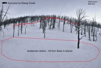 Not only have the mountains near Cooke City received a lot of snow and wind, but snow was falling at a rapid rate yesterday. A heavy load combined with rapid loading means avalanches are very likely. My partner and I remotely triggered a slide near the snowmobile entrance to Sheep Creek (photo) on Tuesday. Also on Tuesday, a snowboarder just north of Round Lake triggered and was buried in an avalanche. Yesterday, visibility was limited but the snowpack gave us other clues of unstable conditions. There were small avalanches on road cuts and we could trigger little slides on small rollovers. Other sledders remotely triggered a small slide near Round Lake and saw another larger one nearby.