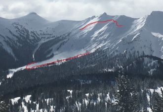 Yesterday, a snowmobiler triggered a large avalanche on Skyline Ridge near Cabin Creek and luckily escaped unharmed (photo). Strong northerly wind yesterday, and westerly wind overnight drifted recent snow into slabs near ridgelines and on cross-loaded terrain features. Avoid drifts and pillows of snow on steep, recently wind loaded slopes, and be cautious of large cornices along ridgelines.