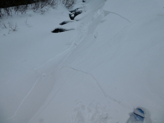 Since Friday, the mountains near Bozeman and Big Sky got 8-12” of low density snow equal to .4-.6” of snow water equivalent (SWE). Yesterday, strong wind drifted this snow into slabs that easily collapsed and cracked under the weight of skiers (photo). More snow and wind today will increase the size of these slabs and they remain easy to trigger. This new and wind-drifted snow will not add a lot of weight to a generally strong snowpack, and avalanches breaking deeper than the new snow are unlikely. Today, avalanches are easy to trigger on wind loaded slopes which have a CONSIDERABLE avalanche danger. On non-wind loaded slopes, avalanches of new snow are possible and avalanche danger is MODERATE.