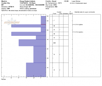 For those of us inclined to take a pass on Black Friday and instead indulge in White Friday, you’ll be much happier because of it. The northern mountains got a light covering of snow (.1” snow water equivalent) with Cooke City getting 3-4” (.3” SWE). Although far apart, the mountains have similarities: 2-3 feet of snow with good stability. Buried layers of facets and crusts that formed in the last 2 months are strong enough to support today’s snowfall. However, the new snow will be prone to avalanche at the snow surface where crusts or weak snow are found (snowpits). Dave and I had this concern in Cooke City (video) and yesterday a skier saw tiny slides (photo) which indicate that bigger avalanches will be possible with more snow. Stick to lower angled terrain if you see avalanches or find cracks shooting out from your skis or sled.
