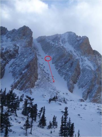 A skier in this couloir triggered a small slab 6-10 inches deep and 15ft wide. He was not buried but he was bruised and lost some gear as the avalanche carried him over rocks. Couloirs like this in the Bridgers often get wind loaded from snow coming off the slabs on the right side of the couloir. This loading makes such couloirs skiable in the early season, but also increases the avalanche risk. This group noticed some cracking on their ascent along the edge of the snow, but continued anyway and admitted they shouldn't have ignored this important clue.