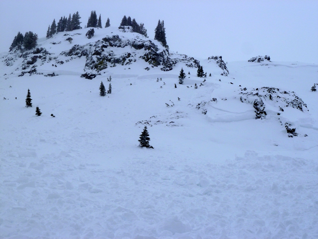 This natural avalanche occurred on a north/northeast facing slope around 9,300 ft. The slide failed on a layer of facets about a foot off the ground. Nearly two feet of new snow combined with recent wind loading pushed this slope past its breaking point. Photo GNFAC