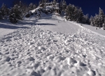 This slide occurred early this week and was likely triggered by snow sloughing off the rocks above. It broke on a thin layer of facets just over a foot deep in an E aspect at about 9400 ft.. In Beehive, Middle and Bear Basins just north of Big Sky this layer can be found on most slopes but is only a problem on a few. Photo: GNFAC