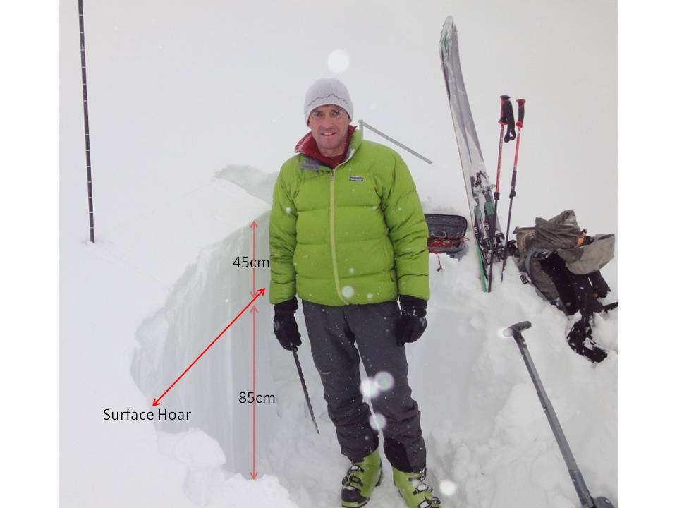 This buried layer of surface hoar was a stability concern 10 days ago.  It easily fractured then, but today (2Jan) it would not propagate in my tests.  The SH likely collapsed during the recent storm which stabilized it.  I found this stability in all 3 of my snowpits. Additionally I got no collapsing or cracking as I toured around.  Photo: GNFAC