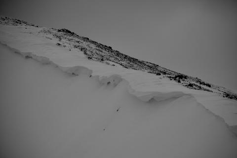Cornices have grown large along ridgelines. Stay far back from the edge and avoid or minimize time on slopes below. Slopes below cornices are likely places to trigger a wind slab avalanche. Photo: B. VandenBos