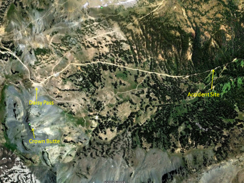 A snowmobier was caught and killed while riding on the road leading to Daisy Pass.  The avalanche came down the slope above the words "Accident Site". The Pass is located up the road to the left. The slide that buried the rider likely released naturally, catching him as he attempted to turn around at the bottom of the path.  Three other riders were also partially buried, two with just their arms sticking out of the snow.  The three riders that were partially buried escaped unharmed.  Photo GNFAC