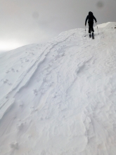 On Saddle Peak, strong west wind (Friday) stripped the ridgetop of uncompacted snow that left elevated ski tracks and pole plants behind. Photo: GNFAC