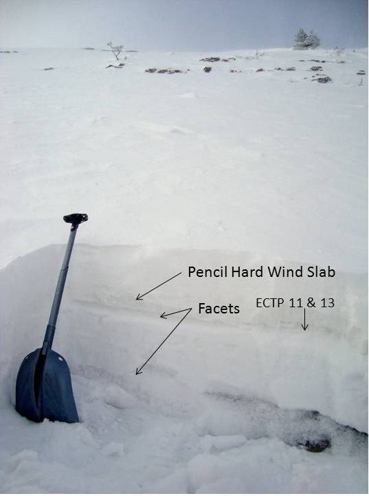 After 20" of fresh snow the snowpack on the Football Field was surprisingly thin. Not only was the pack thin, it was weak. During stability tests we got two ECT's to propagate on facets directly below a hard wind slab. This is discouraging since this area will continue to see loading and lots of traffic. Photo GNFAC