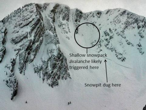A strong storm on Wednesday (12th of December) dropped close to 10 inches of snow totaling 1 inch of SWE in a short period of time. This rapid and heavy loaded pushed this slope past its breaking point. The slide was likely triggered by a sluff or small slab on the steep, upper part of the slope where the snowpack is thinner, then propagated into the deeper part of the pack. Photo GNFAC