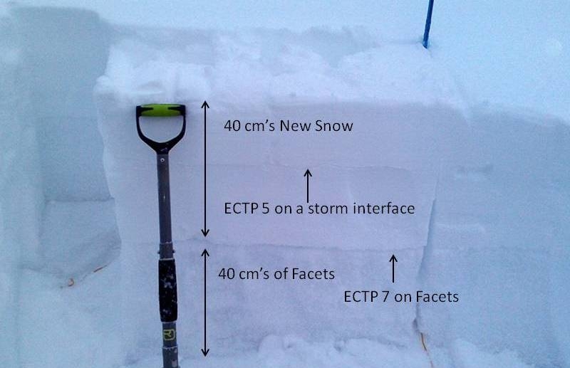 Over the past three days a heay load was deposited on a very weak foundation. Stability tests produced unstable results both within the storm snow and on the new snow/old snow interface. Dangerous avalanche conditions exist on Mt Ellis. Photo GNFAC