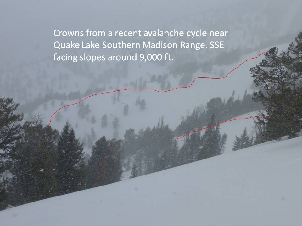 Consistent snowfall and strong winds pushed many slopes past their breaking point in the mountains near Quake Lake. These slides were breaking 2-3 feet deep and propagating hundreds of feet wide. Photo GNFAC