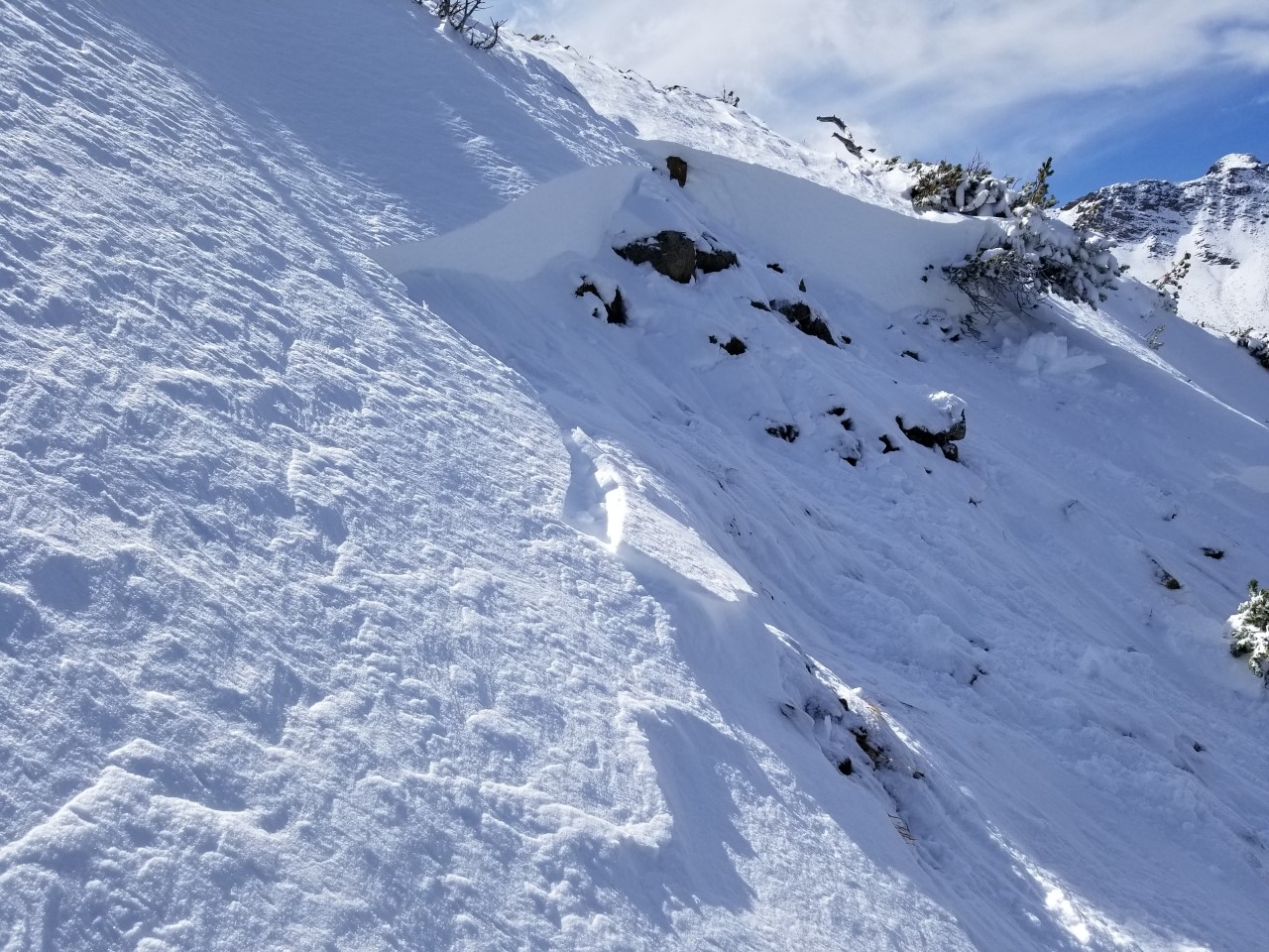 Avoid drifts of snow near ridgelines and steep gullies. These wind slabs will form with more snow and wind, and can be extra harmful with the thin snow cover this time of year.