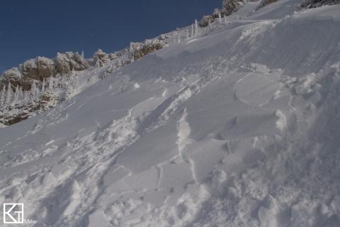 Skiers in the northern Bridgers triggered this small slide near Frazier Basin. New snow sitting on a thin layer of facets was the likley recipe that caused this slide. Photo KT Miller