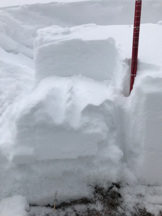 Dug a pit at 9200 feet E facing, 31 cm of snow ECTN 12 at 15 cm from ground, failed on 15 cm of large grain crystals (facets). Skied 200 feet into Bear Basin and it was awful, crushing rocks left and right so we turned around...Just glad we came back without injuries. Photo: T. Allen