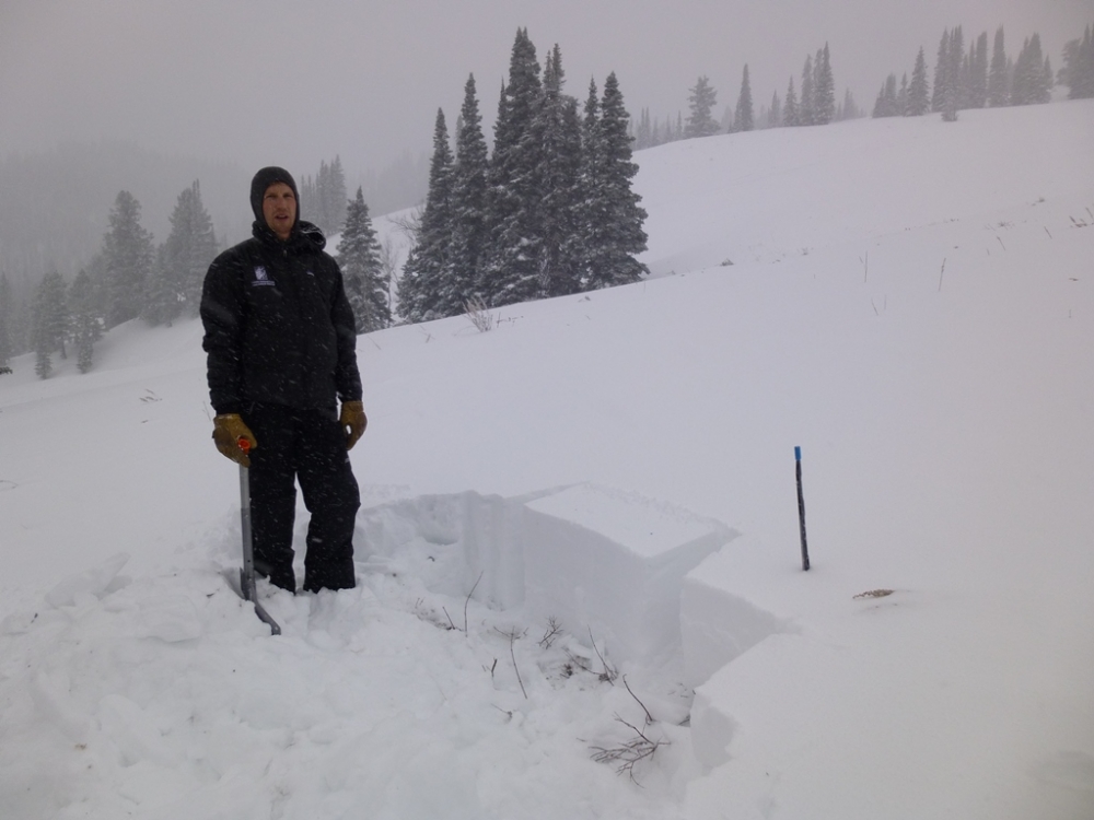 Alex Marienthal at Lionhead finds a thin snowpack that is weak and unstable. The top foot of snow is easily sliding in our stability tests. More snow will make the avalanche danger rise. Photo: GNFAC