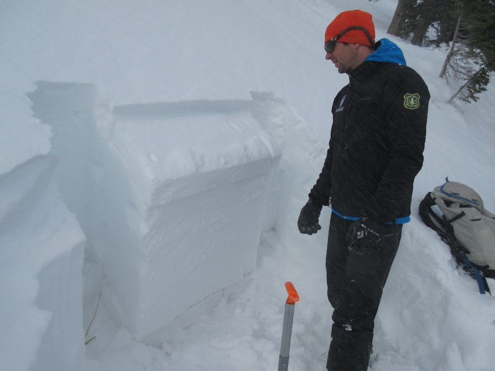 In this pit we had multiple layers propagate in our stability tests. Two wind slabs near the surface, and a thin layer of facets above the hard crust on the ground. ESE aspect at 9,000' near Fairy Lake. Photo: GNFAC