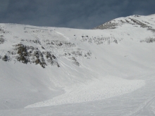 This slide occurred at Big Sky Resort on the Wave wall on Wednesday (1/15/14). It was triggered intentionally with a 6 lb explosive placed low in the path on a piece of bamboo. Two pits were dug in the starting zone the day before. Both showed horrible structure in the snowpack. One gave unstable results in stability tests, the other gave stable results in stability tests. Based on the poor structure and layering the BSSP decided to shoot it and got the results they hoped for. Photo: BSSP