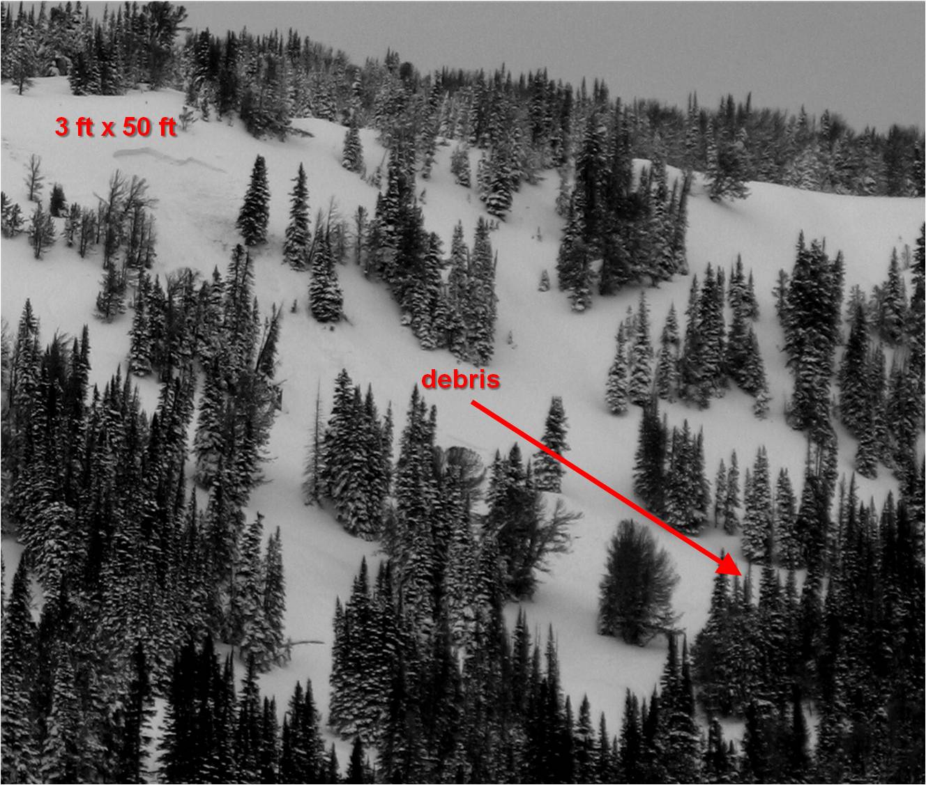 This wind slab was triggered by a skier in the Taylor Fork area of the southern Madison Range. It is located on a south facing slope just off the main trail. "No one was caught but it was a close call." Even small avalanches can be serious when they run through trees that can cause trauma. Photo: B. Goodhard