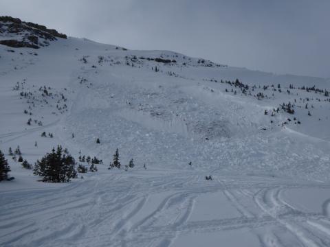 This avalanche was triggered by a snowmobiler on Friday, 27 Dec. It was adjacent to one that already slid earlier in the day. It broke 4-6 feet deep and could have killed someone. It was a heavily wind-loaded slope that broke on sugary facets near the ground. Photo: GNFAC