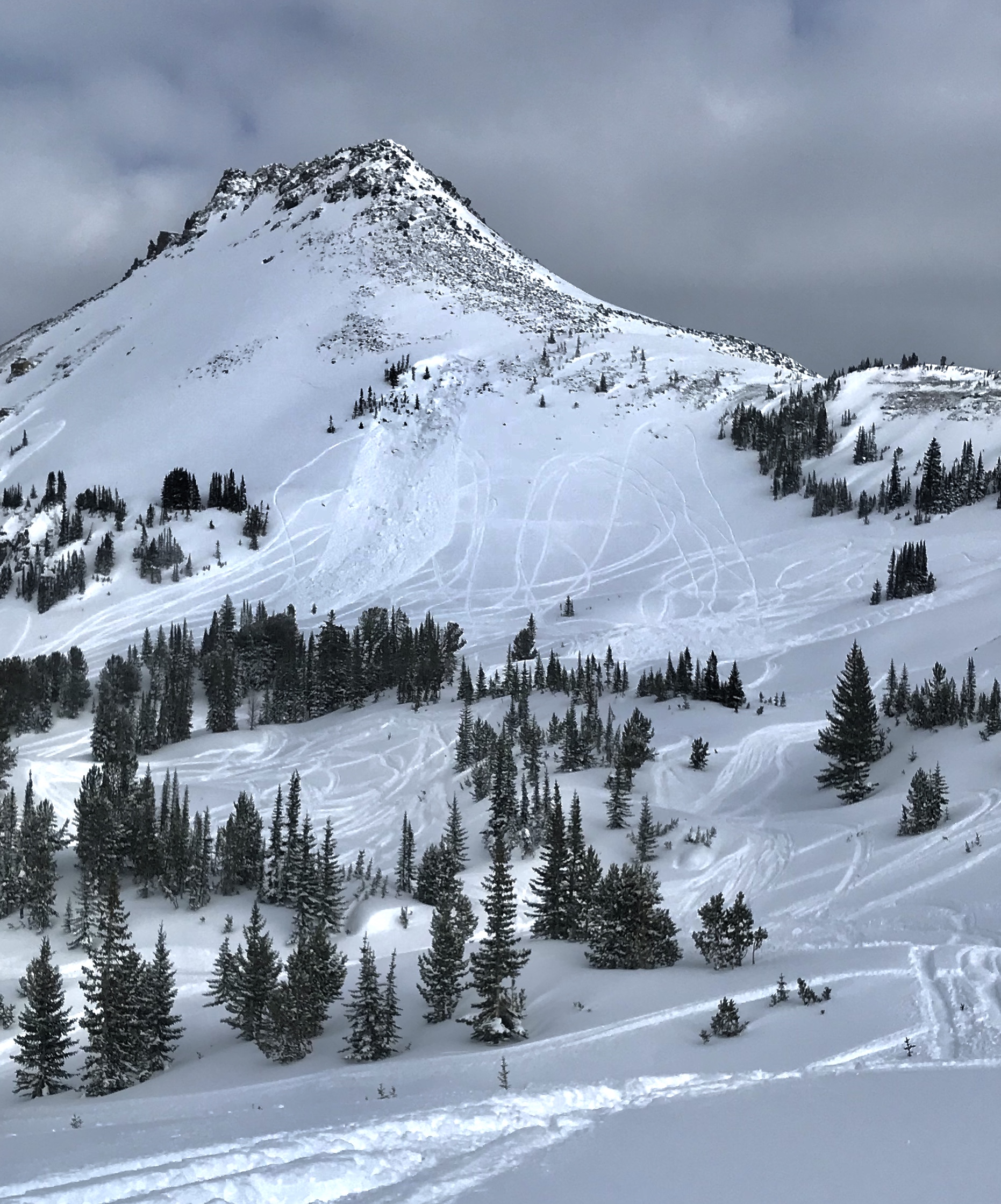 This avalanche on Crown Butte failed after multiple sleds had crossed the slope. From the email: "This one broke about 10 minutes after we’d been sledding below and across it. You can see our tracks going into it. Spooked us. The crown up top looked pretty deep, maybe 3 or 4 ft". Photo: S. Strenge