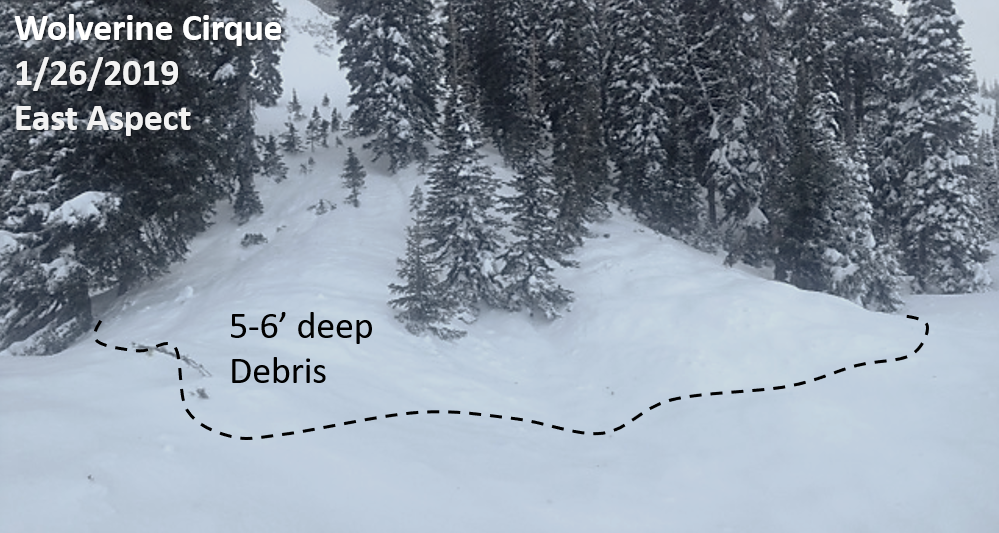 A group with the MSU advanced avalanches class found multiple slab avalanches that released at various times during this week's storm. Three of the slides ran for a large portion of their slide path. This debris pile was from an avalanche that likely failed Friday morning, and was large enough to break small trees in the slide path. Ski tracks nearby suggest this avalanche was skier-triggered. Photo: A. Schauer