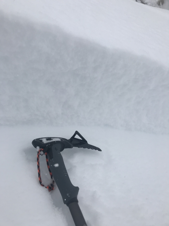 From e-mail on 4/11/19: "We found reactive storm slabs and touchy windslabs near ridgelines. We kicked off a small windslab in 4th of July from the top of the couloir. Attached is a photo of the crown to give you a depth perspective. It was about 6 feet across and 3-4 inches deep."