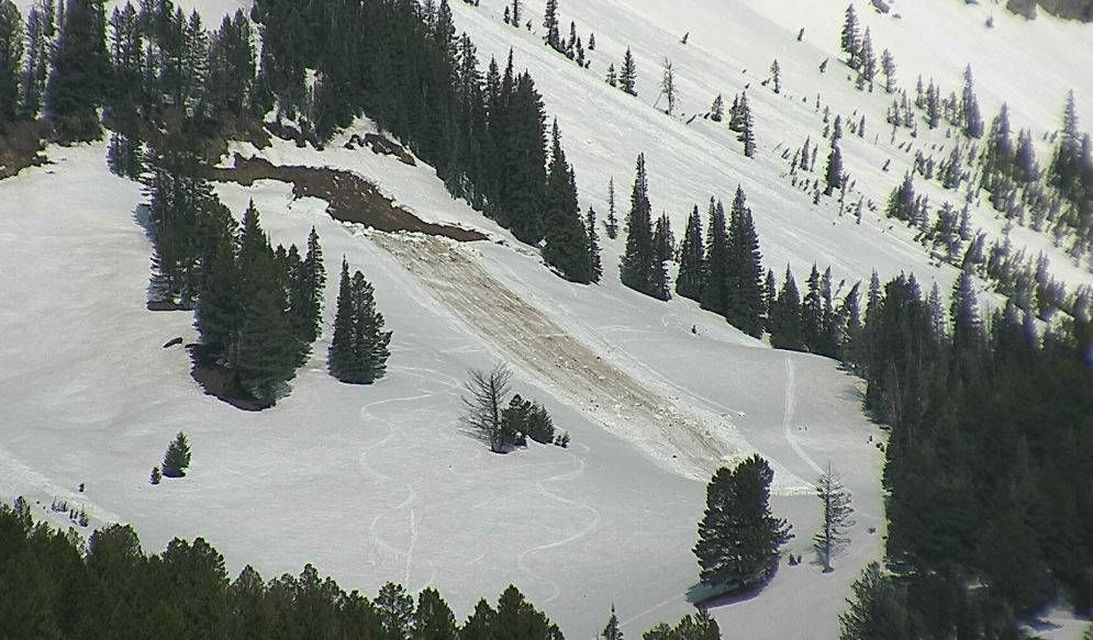 "South side of the Glide Plane released as a glide avalanche last evening (May 12th) sometime around 6 pm according to source. Bed surface was ground in starting zone of wet clay soil sparsely covered in long grass. Debris chunks, some snowmobile sized, rode up on surface and slid approx. 200 vert. Debris could have bumped a tower on the old Alpine lift if it still lived there. Last freeze was 6 am on the 10th of May. The high temperature on the 12th was 59 degrees at 4 pm." Photo and observations: BBSP
