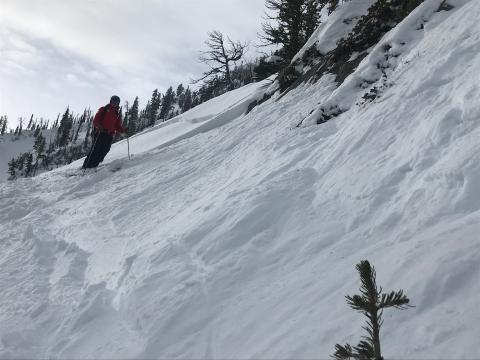 "A 4-14" deep by 30ft wide slab released naturally? below dry martha, we think this morning (1/3/19). it ran approx 300ft over the bottom cliff and stopped near the south bowl traverse." Photo: BBSP