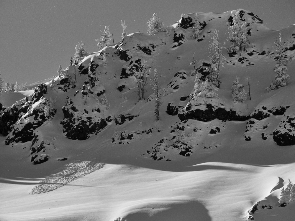 A skier in Hyalite wrote, "Natural activity that I observed was failing at new/old interface and (generally) occurred in predictable, wind loaded locations near ridge lines. The one exception is the avalanche with the freshest debris; looks like it failed right at the end of the storm in a somewhat sheltered, mid-slope location." Photo: B. VandenBos