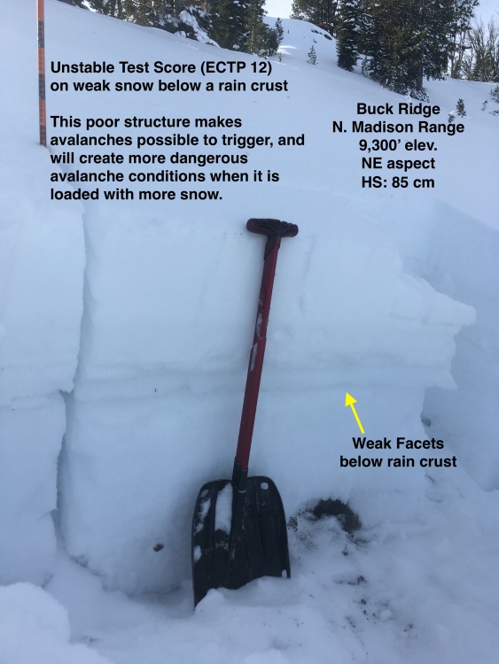 We sledded into Buck Ridge (12/4/2019) for the first time this season. The riding was supportable and soft, but we sank to the ground when we stepped off our sleds. This poor snowpack structure makes avalanches possible to trigger, and will create bad avalanche conditions when more snow loads on top. Enjoy the powder in low angle terrain. Photo: GNFAC