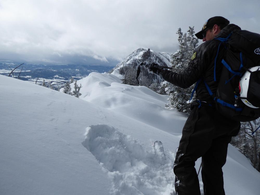Dave Zinn digs a hand pit along the ridge to assess how the new snow is sticking to the ice crust. Photo: GNFAC
