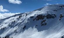 Obs: "School bus size cornices over Easterly portions of Lionhead Ridge. It is hard to tell from the photo, but the largest cornices were about 20-25' tall. We dug a few pits on East Facing slopes between 9,000-9,500 ft with the worst result being an ECTN-21 however these Cornices are primed and ready to fall with the abundant sunshine and warming weather." Photo: JR