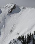 Sunday (3/29/20) skiers near Fairy Lake saw this cornice collapse that ran for quite a ways in October bowl. Photo: T. Gittins