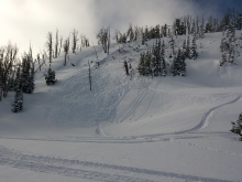 From e-mail: "2nd hand observation arrived at site about 5 minutes after slide. Triggered by sidehilling snowmobiler but was not caught up in it... looked approximately 50 ft wide 150 ft vertical. Did not appeared to be very deep" Photo: P. Gish