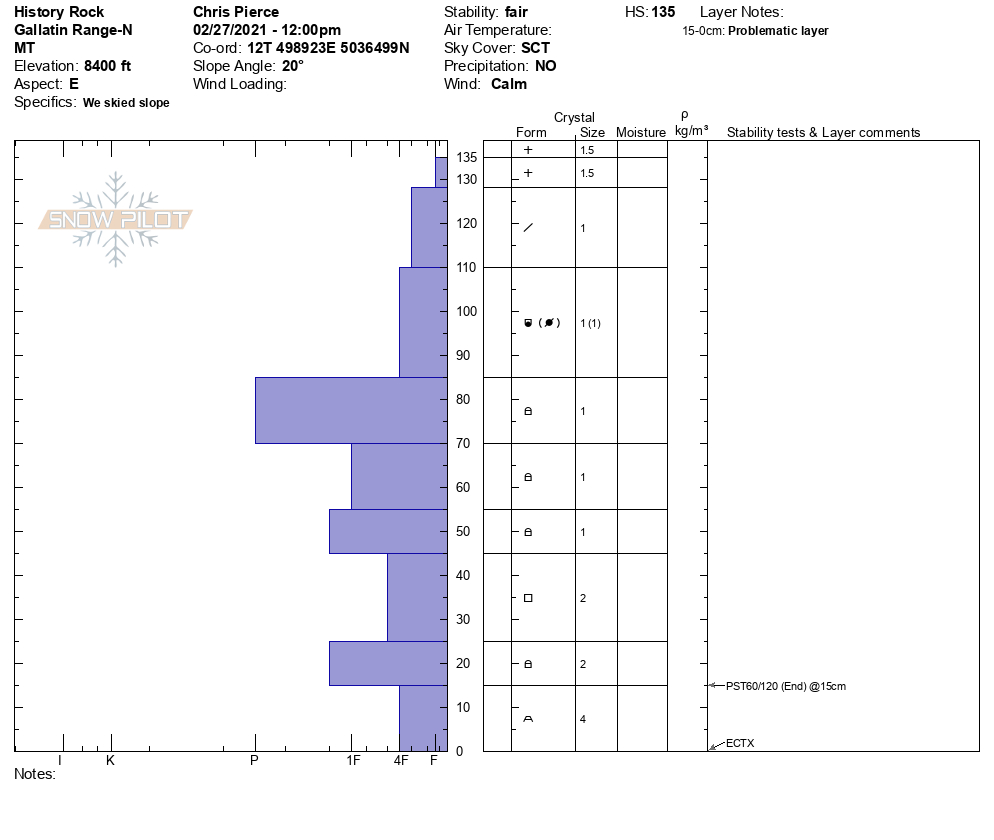 From skier obs 2/27/21: "~6-8" of fresh snow. No wind loading or significant signs of instability. Calm winds with scattered clouds and occasional very light snow. Dug a pit at the summit. ... I found plenty depth hoar at the bottom of the snowpack. It was not as weak as what I've seen earlier this season (4F), but we're still talking 4+ mm grains with well formed cups. ECTX and PST 60/120 to end on the depth hoar layer. Pit profile attached."