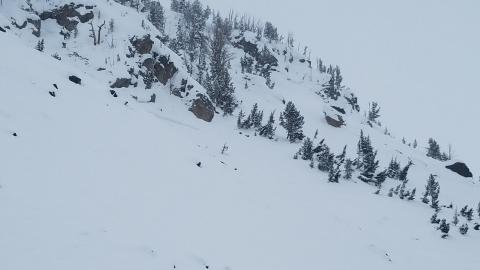 From email: "Went out in Middle Basin north of Big Sky today and saw 5 separate slides, the largest about 500ft across and approximately 2ft deep. All of them were northeast to southeast aspects from about 9200 to 9800ft. The included photos aren't the best but give an idea of the slides, most are from that largest slide." Photo: B. Richards