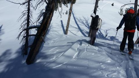 Skiers near Meridian Peak observed cracking in the snowpack. It appeared to be the wind-drifted snow sitting on top of a layer of feathery surface hoar buried about a foot under the snow. Photo: T Parrie