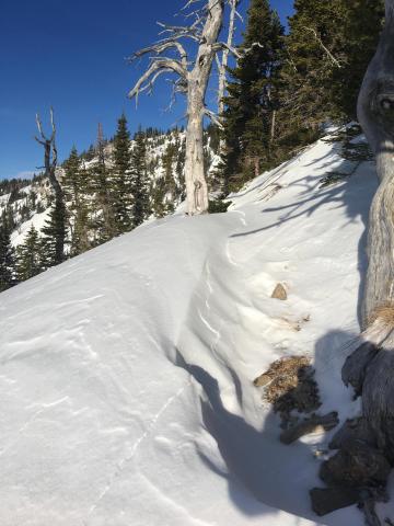 A skier had widespread collapsing, "whumphing" and cracking of the snowpack in Truman Gulch west of Bridger Bowl. Photo: P. Hinz