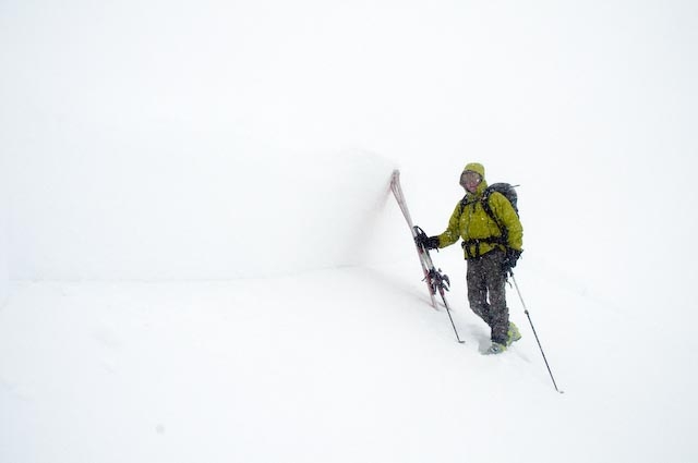 Stiff west winds created hard slabs that we triggered from the safety of the ridge. Even as I tried to write my snowpit notes the slope was reloading. Photo: Ross Lynn