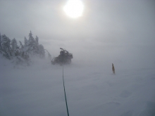 Nick Bilton uses the Yamaha as a wind break as he belays me over to a cornice. Strong winds loaded a slope below us which avalanched earlier in the day. Lots of powder from last weeks storms is being blown onto leeward slopes. Photo: Doug Chabot