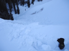 Seven snowmobilers were playing on a slope when one person triggered this slide, but was not caught. This avalanche happened on Saturday, Jan 7 in Cabin Creek. Although it was not very deep, the debris ran into a terrain trap. Photo: J. Noorlander