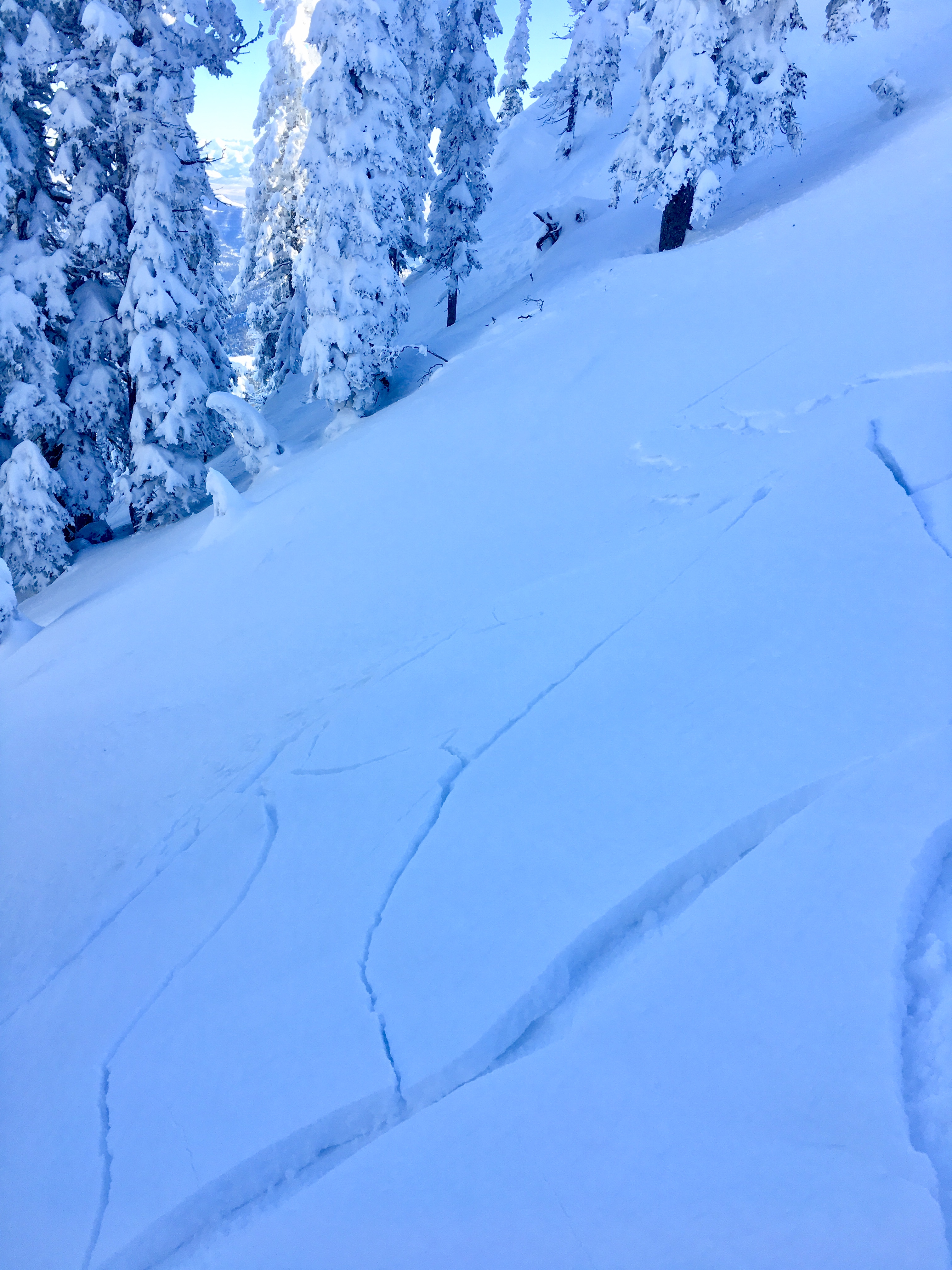 Strong winds in the Bridger Range formed dense slabs on lleewardslopes. Yesterday, A skier north of Bridger Bowl triggered multiple wind slabs near the top of Wolverine Bowl. The skier turned around and chose a safer objective. Photo: S. Whitefields
