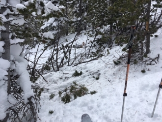 From text: "this one was interesting because it was so low angle and in quite tight trees. We were in a zone south of Livingston today (1/26/19), near 9k’, NE asaspectn dense timber not far from a ridge top. The slslideay have been remote triggered by us skinning up or a large wind gust that came from the other side of ridge. We were touring up low angle terrain and had multiple large collapses on our ascent. We came to what was going to be our turn around point where my brother and I were discussing where we would rip skins and drop in. Before we proceeded into the timber on a 28deg slope we noticed a lot of tree bombs then saw the slslideoming through the trees and taking out a couple of 10” diameter snags along the way. These trees were barely skiable due to how tight they were and the starstarting zone only a hair over 30 deg. The crown we could see looked to be 3’, and 300’ wide. I’m unsure on the the distance it ran, but estimate 500-800 vertical ft. The main point I got from this slide was slidewe were crowding connected terrain, things are sliding at the very relaxed end of the slope spectrum, and don’t be lulled into a false sense of security in fairly dense timber."