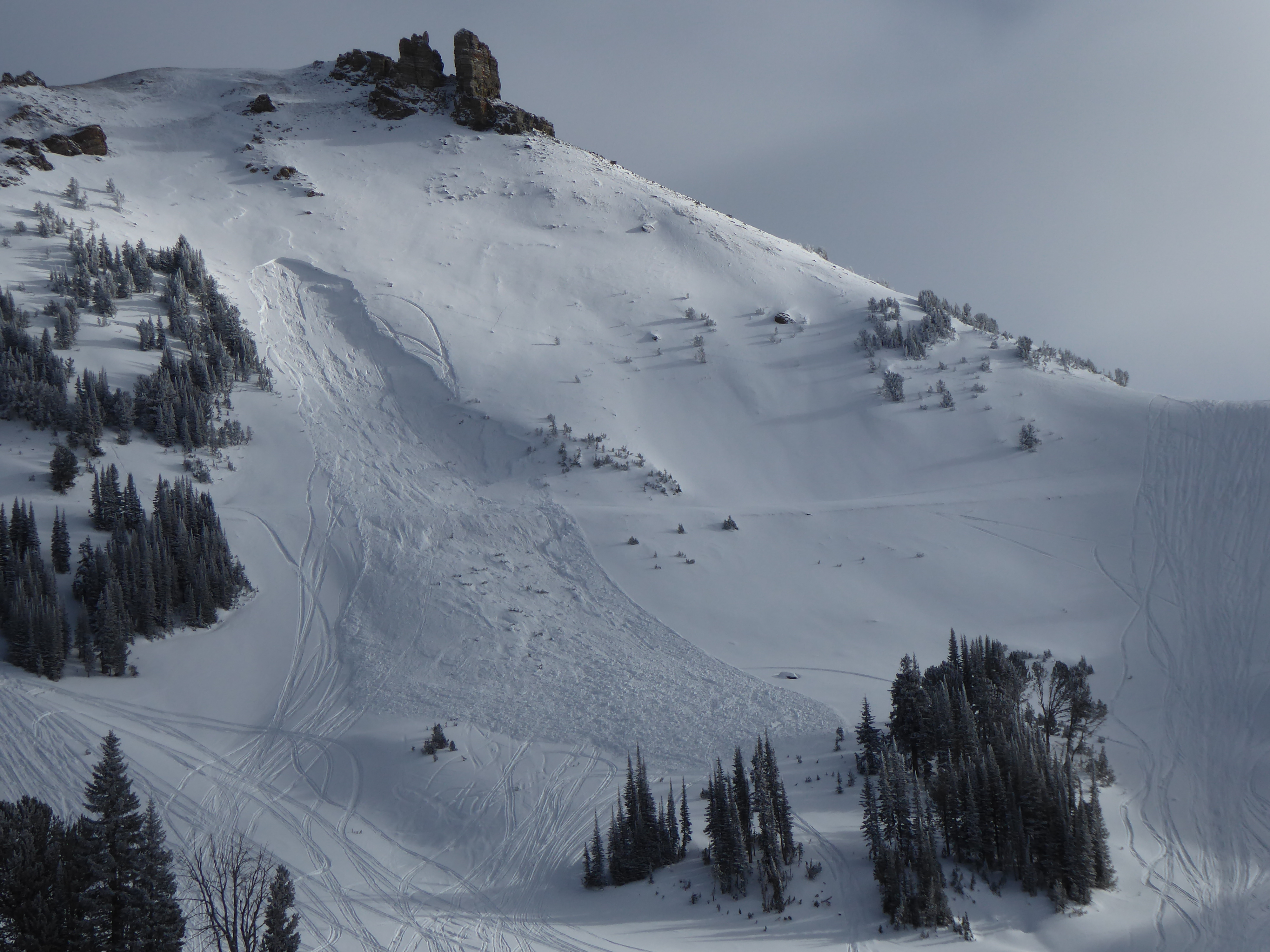 A snowmobiler triggered this avalanche. He was not caught. This slope is below Chimney Rock next to Daisy Pass. It is a heavily wind-loaded slope and failed on facets at the ground.
